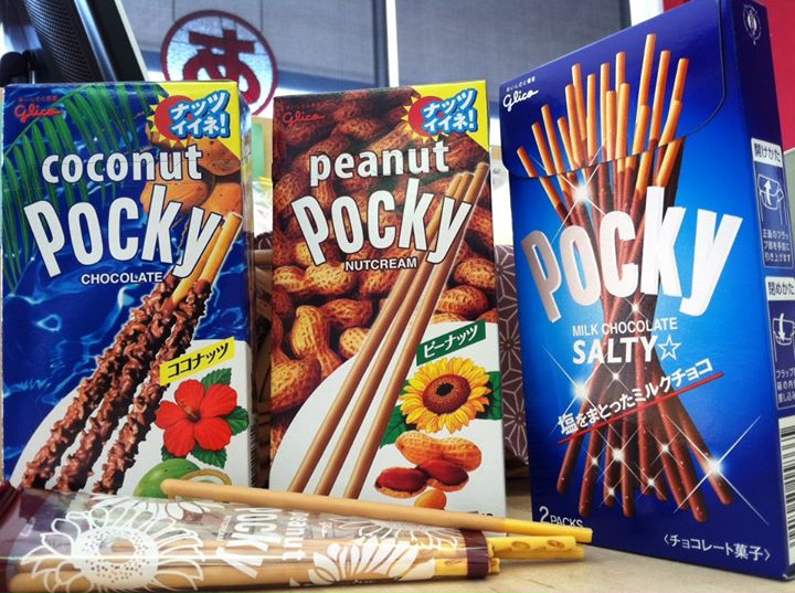 Pocky (ポッキー) is a sweet Japanese treat that consists of a biscuit stick covered with a type of chocolate or cream. Pocky got its name from the Japanese onomatopoetic phrase pokkin-pokkin (ポッキンポッキン), the snapping sound made when the biscuit snapped. Pocky is cleverly designed with a “handle” that you can eat; instead of covering the entire biscuit stick in the chocolate, a small portion is left dry at the bottom: the perfect size to hold onto as you’re snacking away!