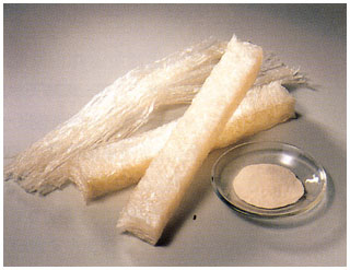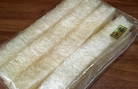 The block of tokoroten can go through a freeze-dry process in order to make kanten (寒天), a completely vegan jelly substitute that can be used in all kinds of sweets or to thicken liquids without having to use gelatin. It can be bought in block, stick, or powder form. Funnily enough, bo-kanten, which is the stick form, can also be rehydrated and used to easily make tokoroten at home.