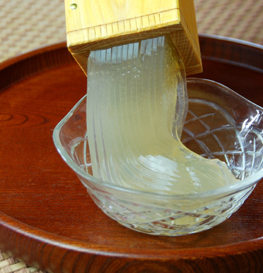 In Japan, the summer months are known to be hot and humid, so it makes sense that there are many different dishes made to help keep you cool in the summer weather. One such dish is known as tokoroten (ところてん), a noodle dish made of clear kanten jelly noodles with a crisp dressing. The dressing can be sweet but very often tokoroten is served with a sour and refreshing vinegar based dressing.
